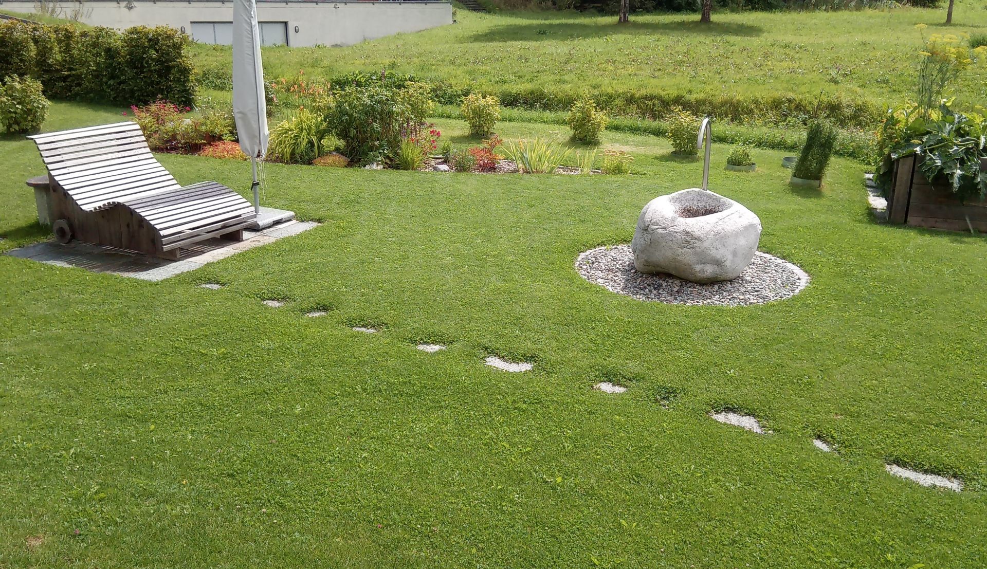 Gartenanlage aus Steintisch, Steinbrunnen, Hochbeet und grüner Wiese in Tarasp im Engadin.